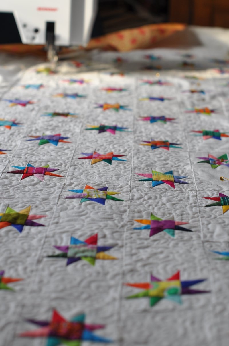 It was a real Crafturday. Four people sewing!! D worked on some button fly jeans from the thrift store; he removed the buttons and inserted a zipper. His girlfriend finished making a skirt. P worked on her valentines and I did some custom quilting.