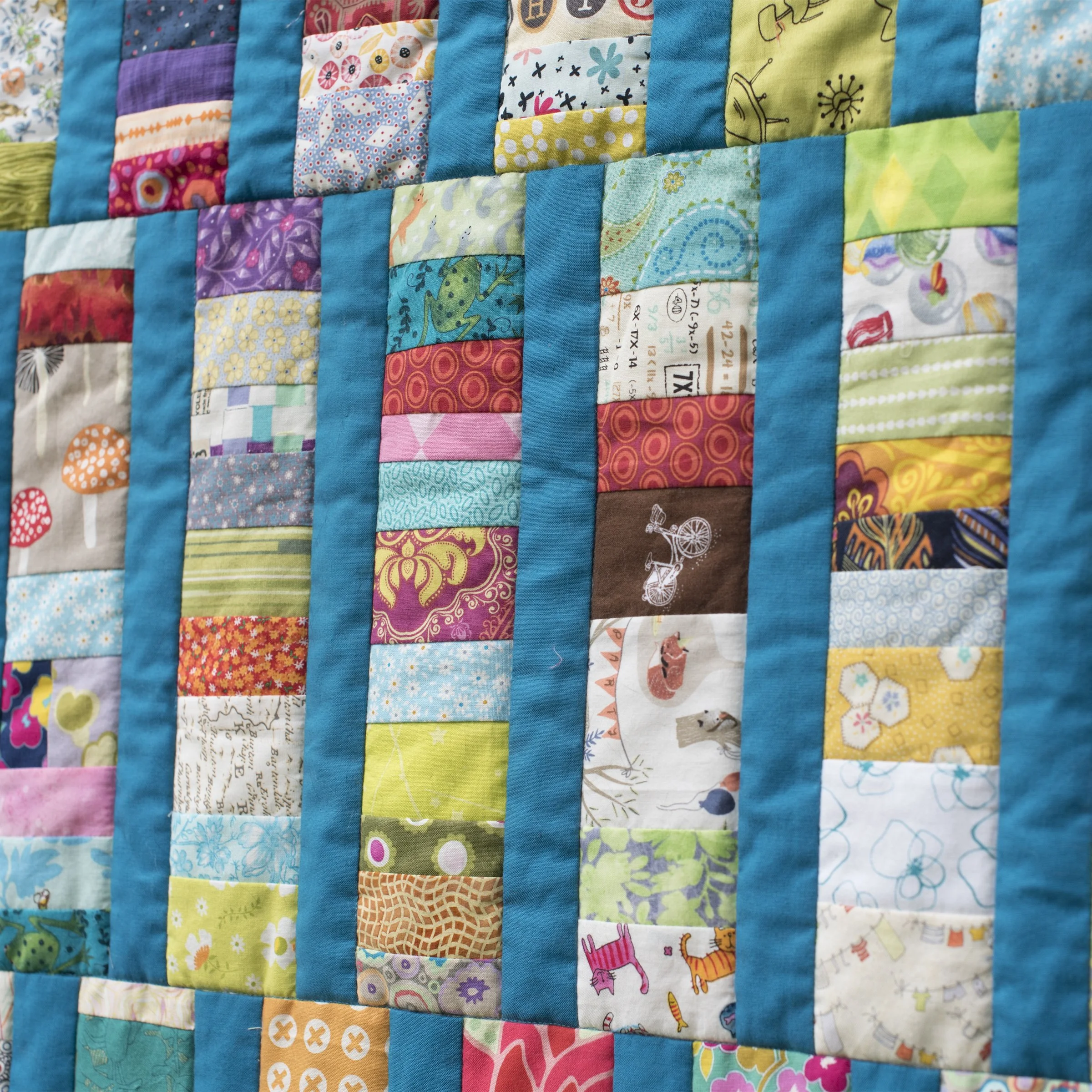 I used my 3” x 12” ruler to make the string pieces units for this quilt. The units are set together with narrower strips of a deep aqua solid.