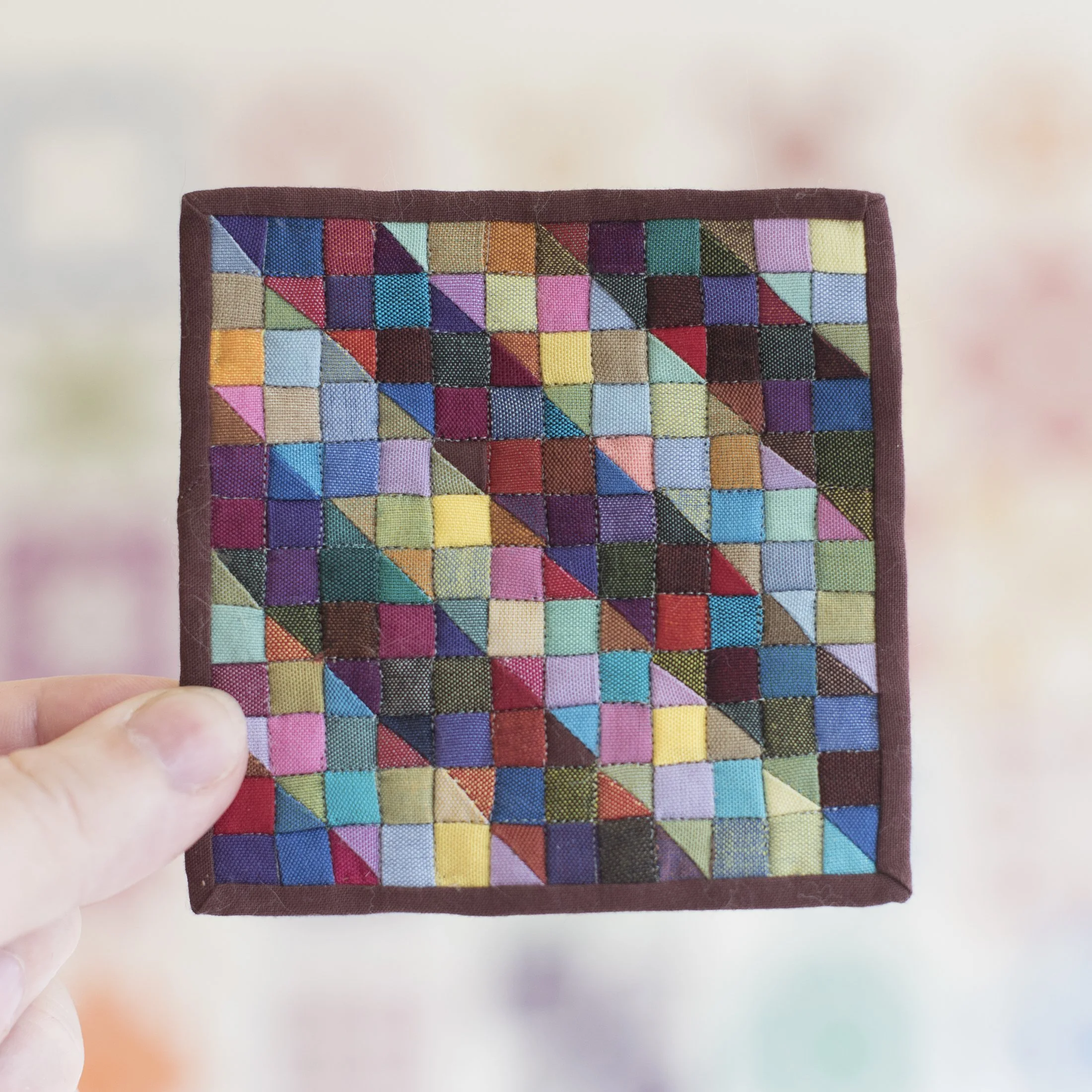 I had this little quilt top in my Tiny Piecing teaching notebook for a few years and now it is a full on finished and bound quilt! This little beauty is 4.5” square and will be the largest quilt in the show. I can’t wait to see all the little quilts on display with little Playmobile gallery visitors!