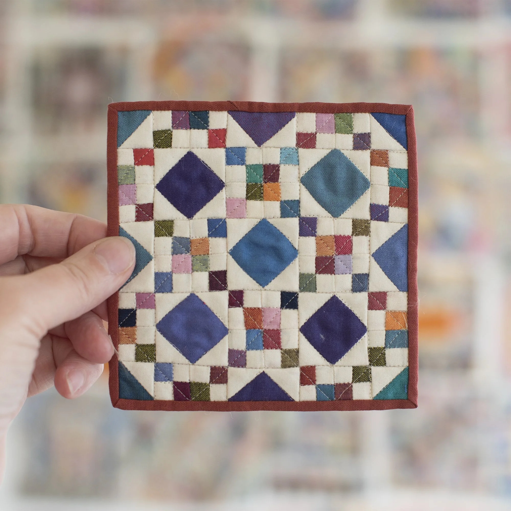 I had this little quilt top in my Tiny Piecing teaching notebook for a few years and now it is a full on finished and bound quilt! This little beauty is 4.5” square and will be the largest quilt in the show. I can’t wait to see all the little quilts on display with little Playmobile gallery visitors!