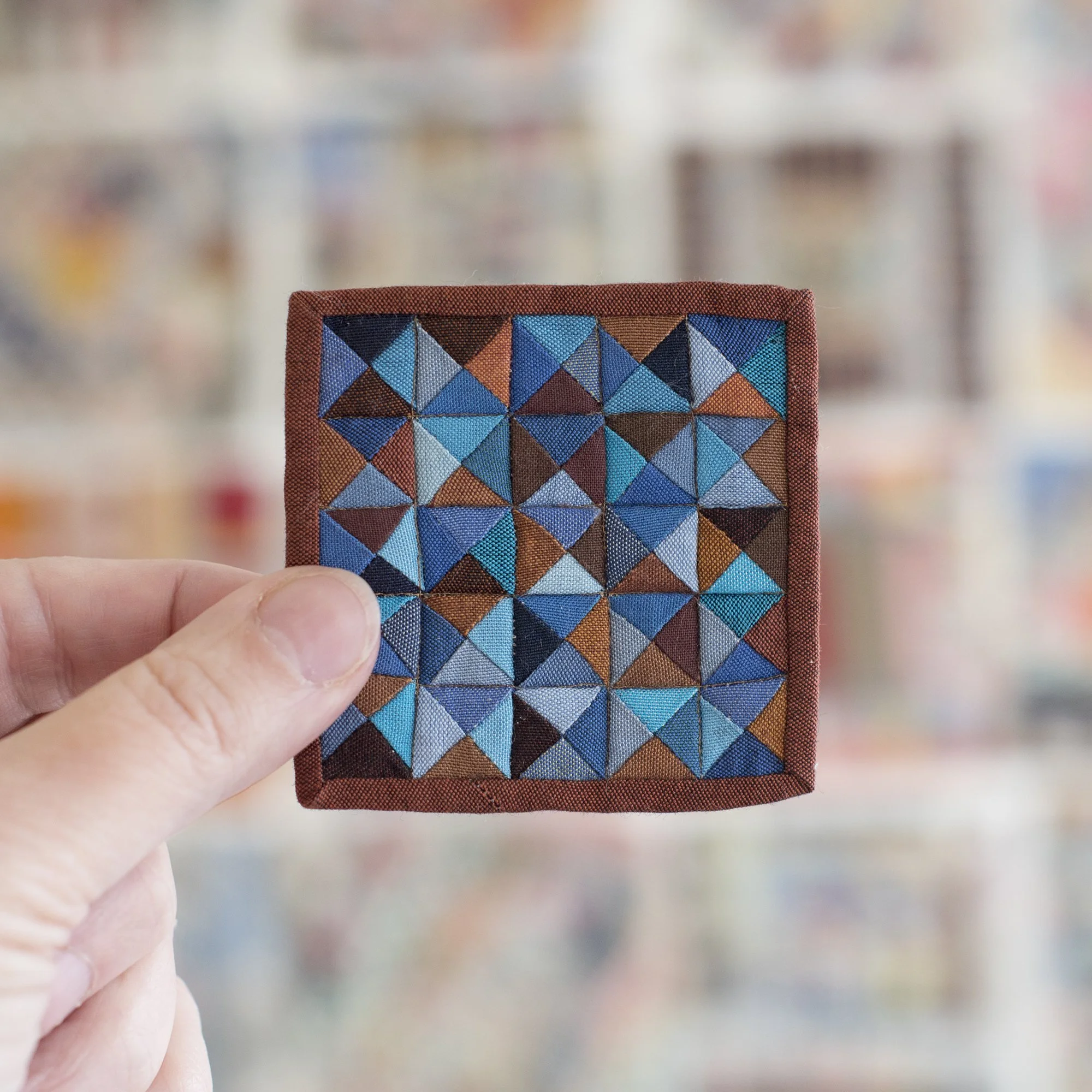 I’ve been working on teeny tiny quilts for my upcoming solo show. Below is the set up I use for tiny piecing. I have a small area for cutting, pressing and sewing that I can reach while sitting to sew. The featherweight sewing machine gives really good results when working small.